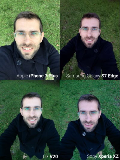 Galaxy S7 Edge cho chất lượng hình ảnh hơi tối, nhiều vết loang lổ. LG V20 trộn lẫn màu vàng với tông màu của da, phá hủy chi tiết trong những gương mặt. Sony Xperia XZ thực hiện khá tốt việc nhận diện khuông mặt, tuy nhiên hơi thiếu sáng và màu da chuyển sang hơi hướng màu cam. Chiếc iPhone 7 Plus cho hình ảnh hơi mờ, nhưng nó cho sự cân bằng sáng chuẩn, các chi tiết sắc nét.